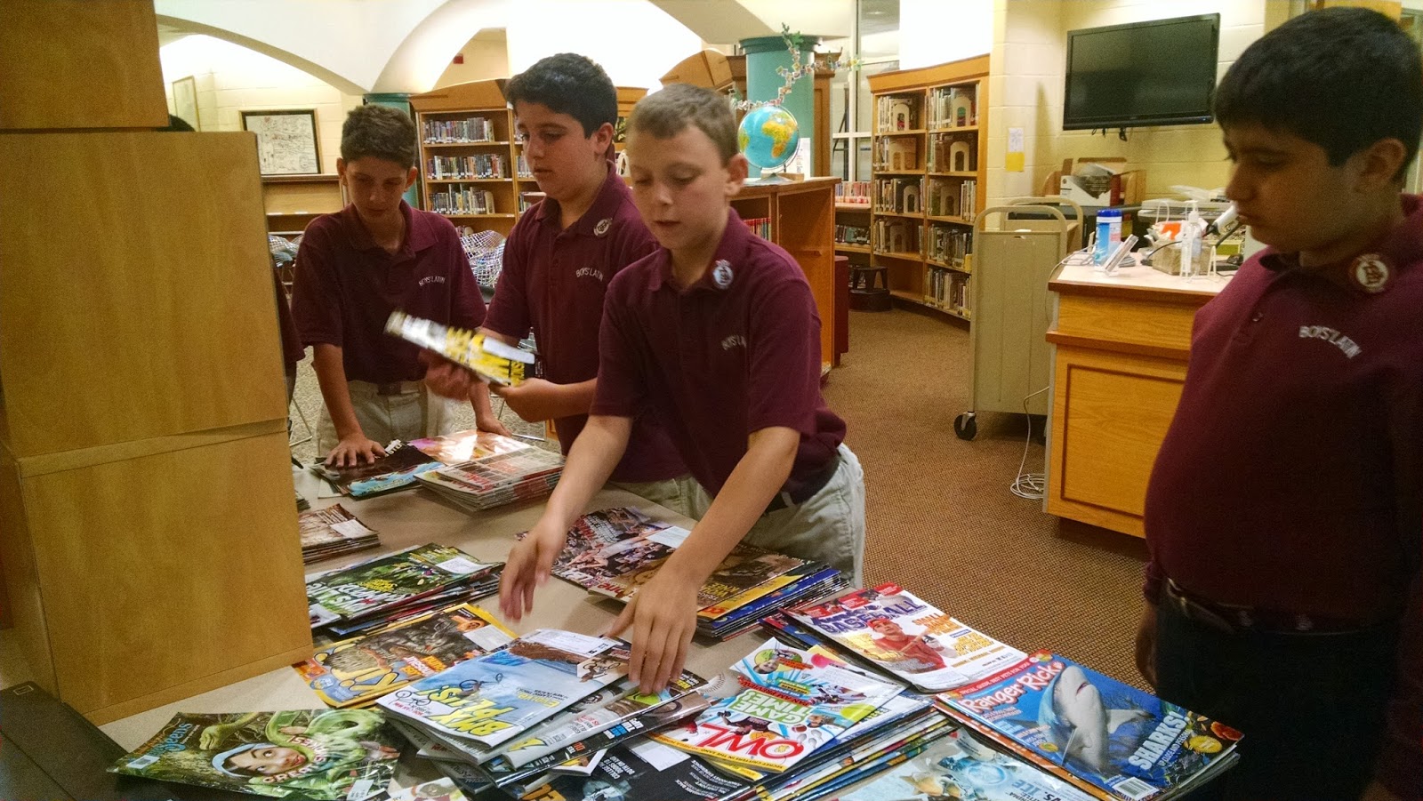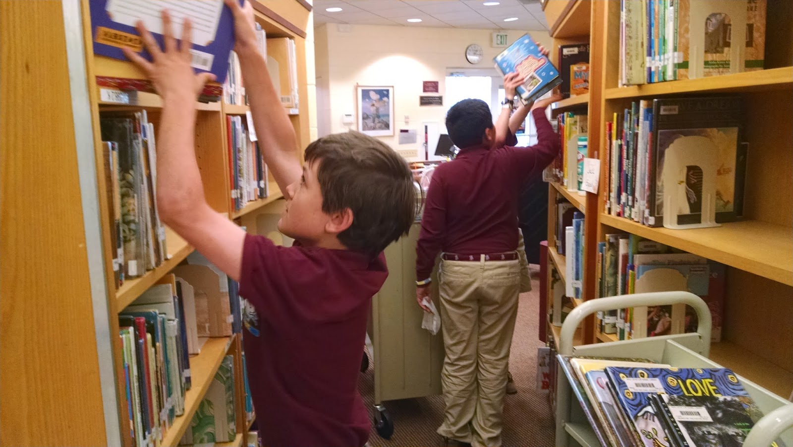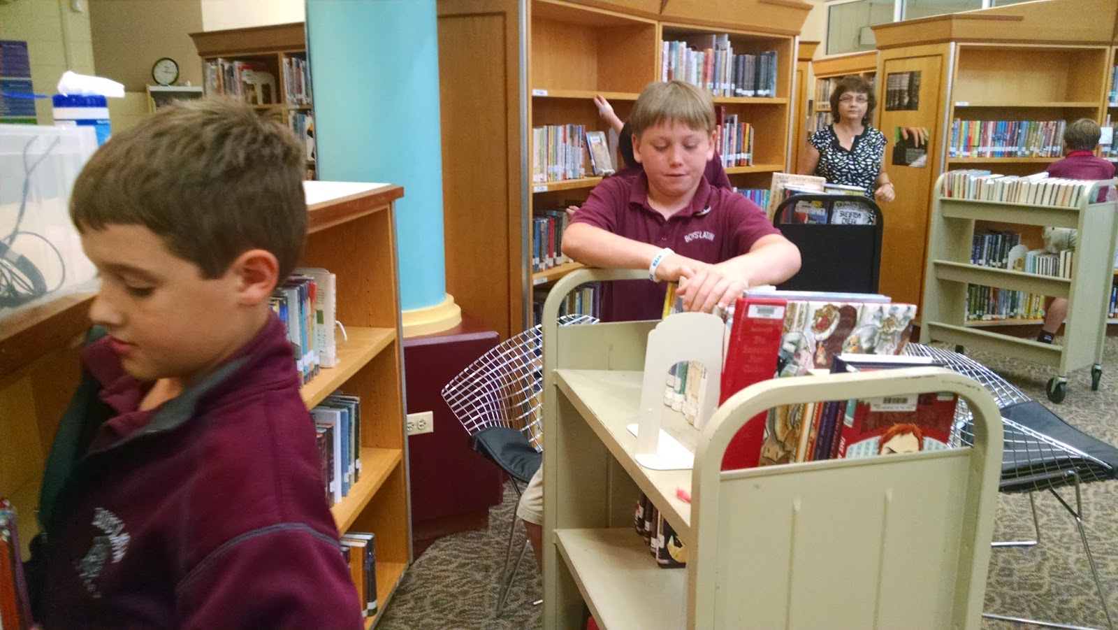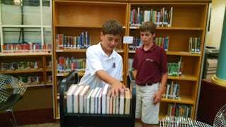 In year's past our fifth graders bring in money to buy a book as a parting gift to the library. This year the fifth grade teachers wanted the gift to be more meaningful to the boys, and decided to have the boys offer the gift of service. As the school librarian I was a grateful recipient of much of that service. Boys were reading and cleaning shelves, removing the batteries from our Playaways, and sorting magazines for a start. As you'll be able to see they took their jobs very seriously and they did a good job.