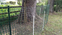 Our neighbors spotted the nesting pair strolling across their yard. So now it was time to take to the internet and research mallard ducks. The first thing I learned was that EVERYTHING eats duck eggs and/or baby ducklings. Yikes! I started to imagine hungry foxes, crows, and possums everywhere! We also had to consider our dog. Keeping him on a leash for a month or more seemed daunting, especially since we have large windows that look out into our backyard and Cody positions himself there ready to keep the yard free of any squirrel that dare to trespass. The ever resourceful hubby fenced in the area around the tree that is serving as home for the nest. The duck goes in and out freely, and the dog stays out.