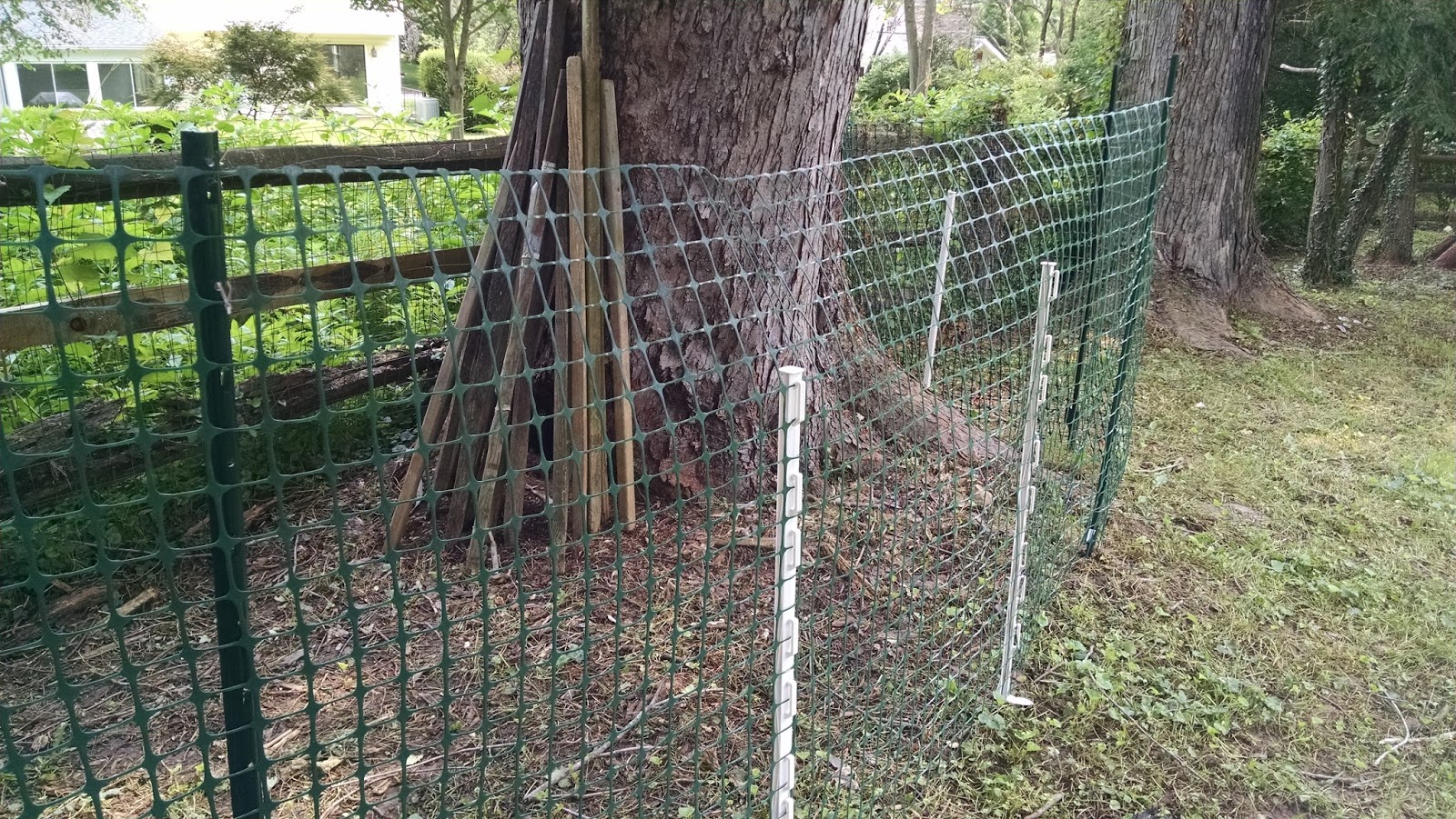 Summer means yard work and tackling some of the tough parts of the yard. One of the few neglected areas in our yard is the very back by our fence. This is where the compost pile is, where the extra stakes for the tomatoes come to rest, and where poison ivy grows in abundance. Recently while attacking the poison ivy my hubby found a nest of eggs on the ground in the hollow of a tree. There were 5 of them and they were about the size and color of a chicken egg. The wooden spindles you see in the picture are extra tomato stakes -- industrial sized, because the hubby grows amazing tomatoes!